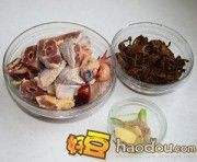 鸡子剁块;蘑菇用温水浸泡至软,把泡蘑菇的水澄清留下,蘑菇去老根洗净;葱切段、姜切块