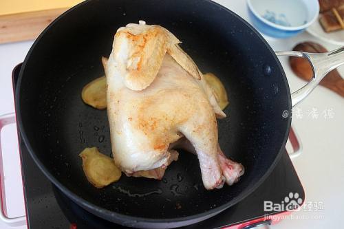 正面,背面、左侧面、右侧面统统都要煎一下,让这只鸡的表皮尽量的上色。
