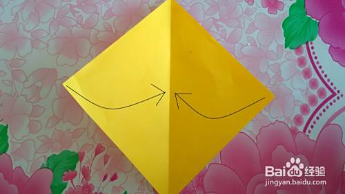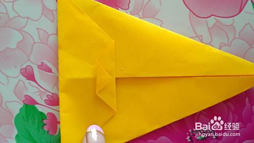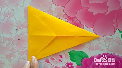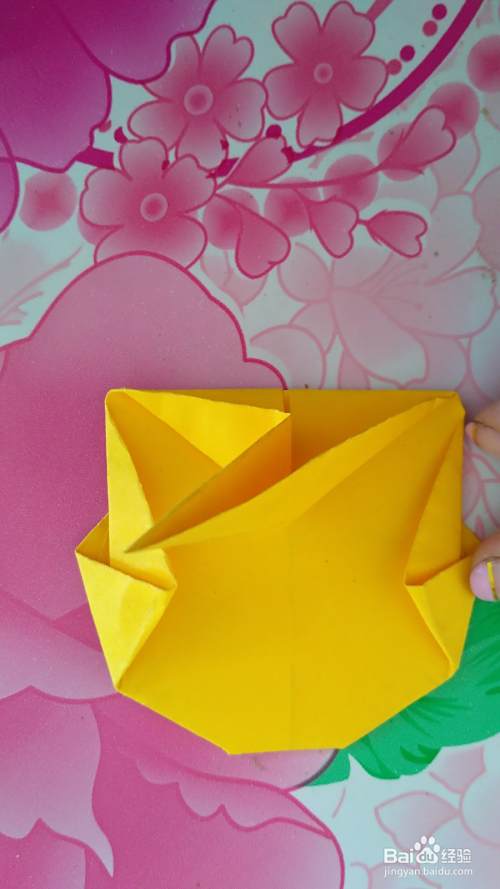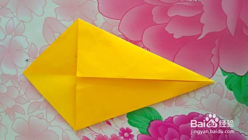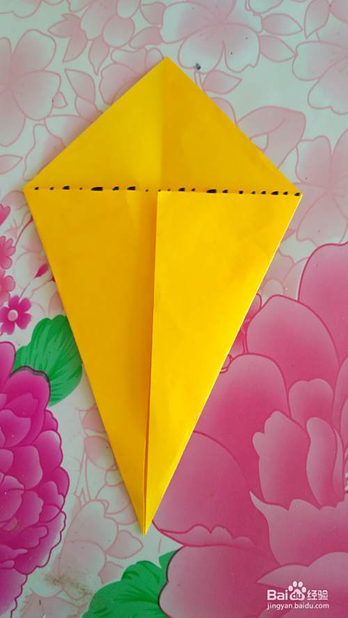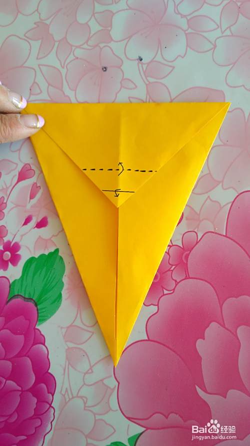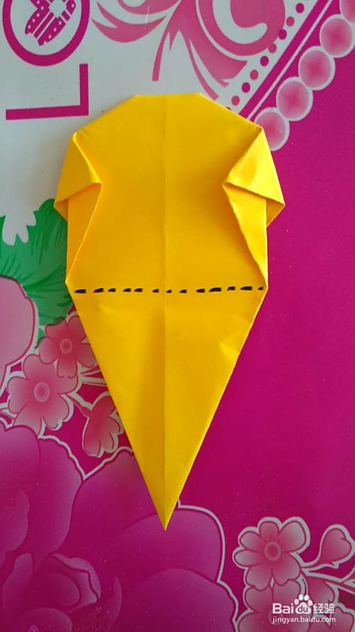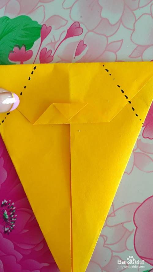 把彩纸翻过来(如图),按虚线部位向上折出尾巴(如图)。