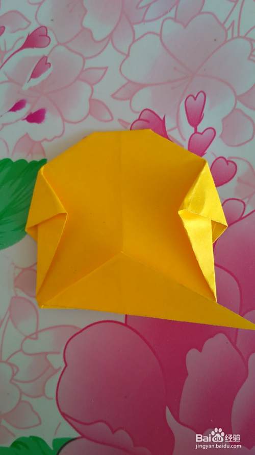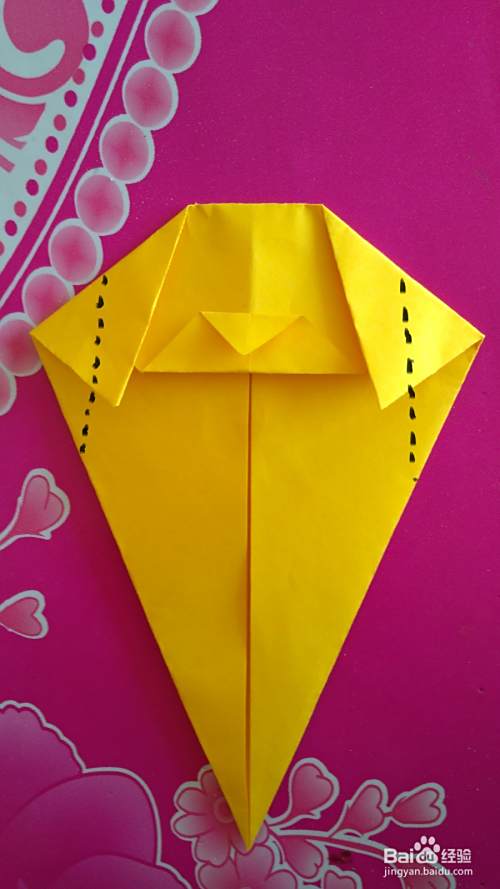 按虚线向内 折(如图),折出小狗的耳朵(如图)。