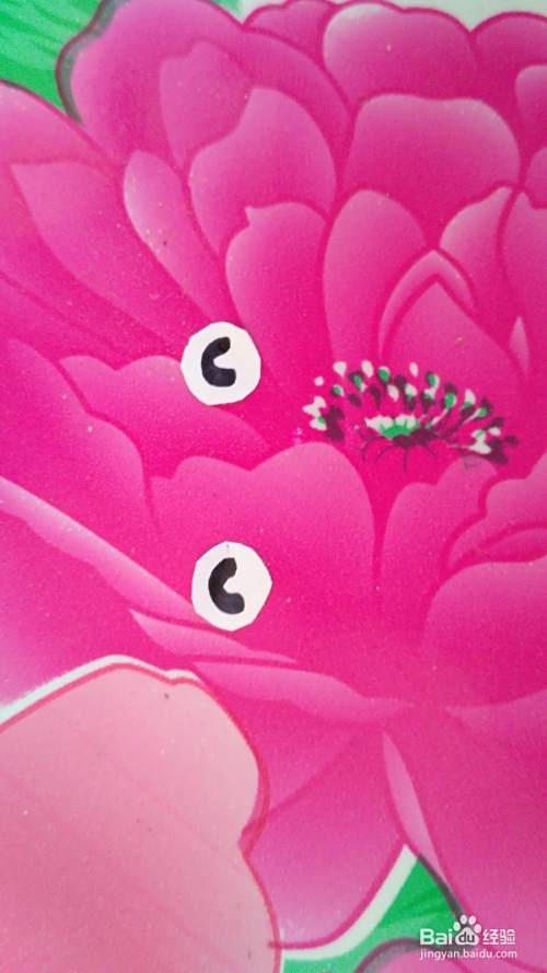 用剪刀剪两个白色圆形纸,再用记号笔画出眼睛,用胶水粘在小狗头部合适位置(如图)。
