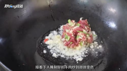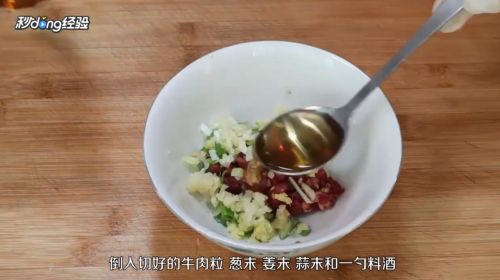 3准备一个空碗,倒入切好的牛肉粒、葱末、姜末、蒜末和一勺料酒,腌制10分钟左右。