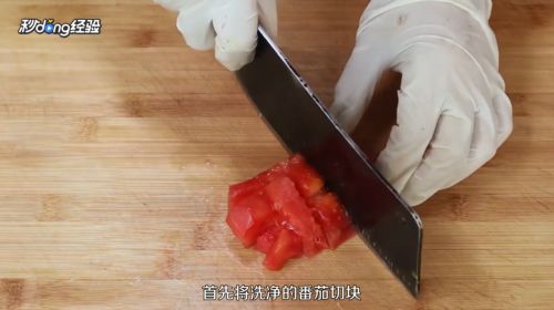 2首先将洗净的番茄切块,牛肉切肉粒备用。