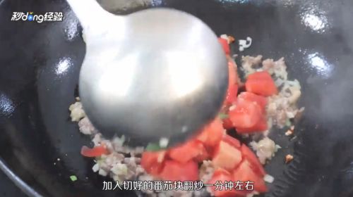 6加入切好的番茄块,翻炒一分钟左右,加入适量的水,盖上盖子煮开。