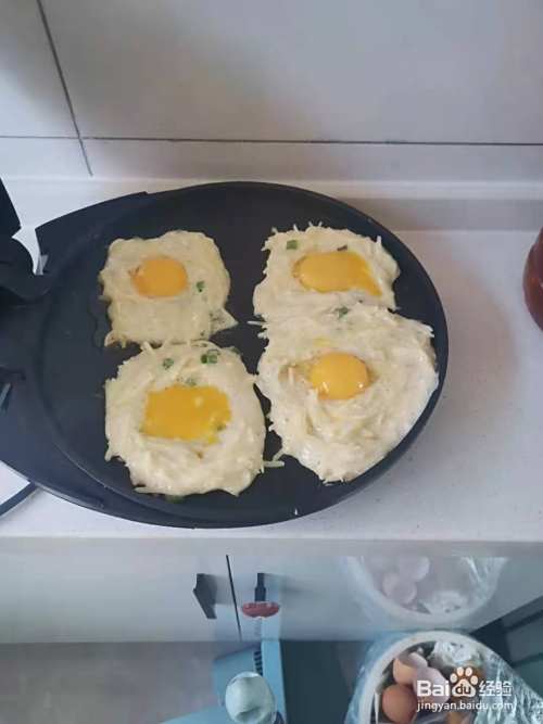 舀一大勺搅拌好的土豆丝,放入饼铛中,把中间掏一个窝,放入鸡蛋黄。