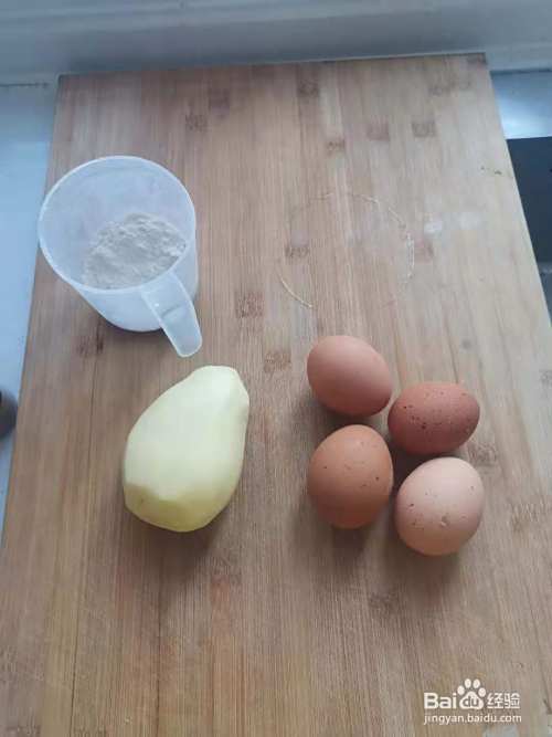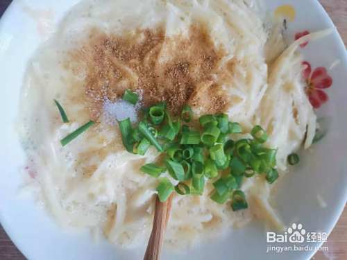 蛋清放入土豆丝中,并加入少许盐,少量胡椒粉及适量葱花,倒入一勺面粉,搅拌均匀。此时顺便将饼铛刷油预热。
