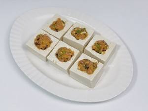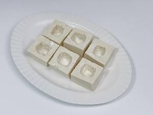 ▪️老豆腐分成6块,用小勺子在豆腐中挖个洞;挖出的豆腐碎,待用。 ▪️在豆腐洞四周抹上一层淀粉,这是煎肉馅不会掉出来的关键。