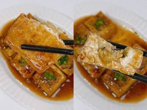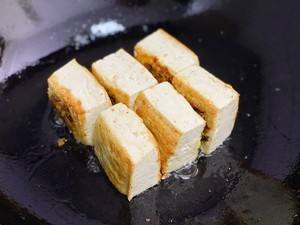 有肉馅的豆腐面朝下,先煎有馅的一面,煎至金黄定型,再翻面。