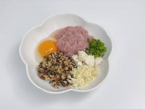 ▪️调制酿豆腐的肉馅: 猪肉馅、豆腐碎少许、鸡蛋1个、香菇碎、蒜末、葱花、食盐少许、生抽少许,顺时针搅拌至肉馅上劲。