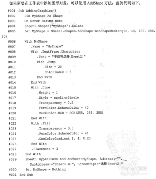 excel工作表的自选图形有很多种,读者可以根据需要插入某种自选图形。在这里,强烈建议读者通过录制宏的方式录制插入自选图形的宏,然后再对宏进行分析,以便掌握不同自选图形的插入方法。