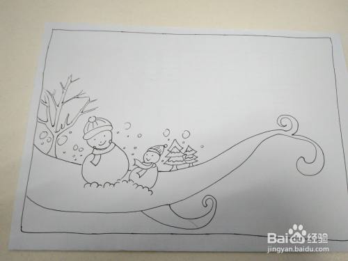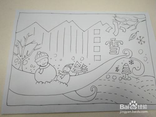 在手抄报的右下角绘制松树、雪花和曲线格子