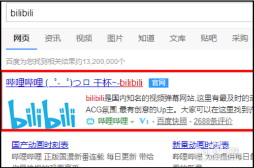 1、打开百度然后搜索关键词bilibili,或直接输入汉字哔哩哔哩,找到官网进入。
