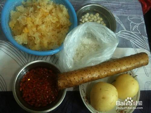 银耳,白莲子,枸杞用凉水泡发,雪梨,山药去皮,核,切成小方丁。注意,为了让山药不氧化变黑,在水中去皮。