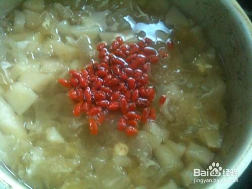到时间关火,放气开盖,加入枸杞子,煮开后即可食用。