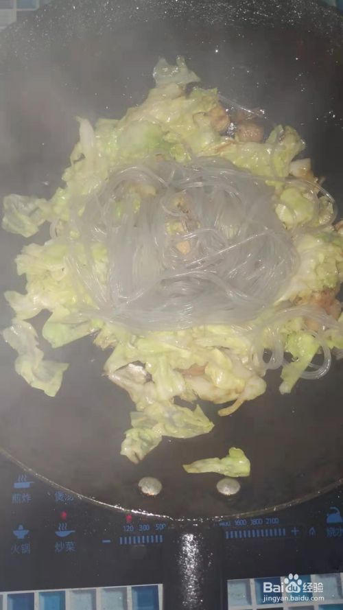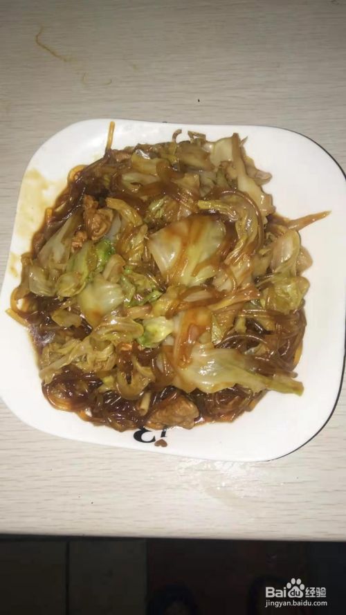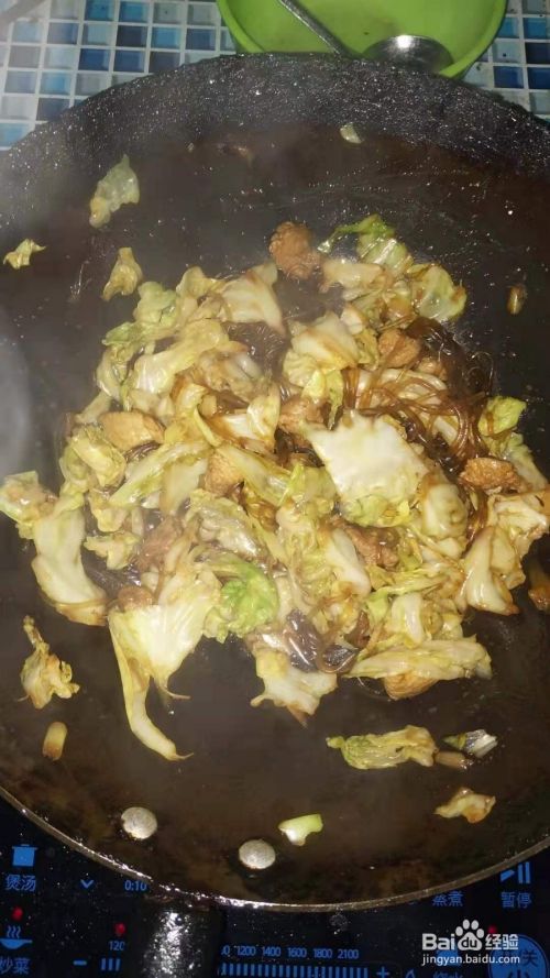 将事先准备好的包菜和粉条下入锅中,放入一小勺老抽,翻炒均匀