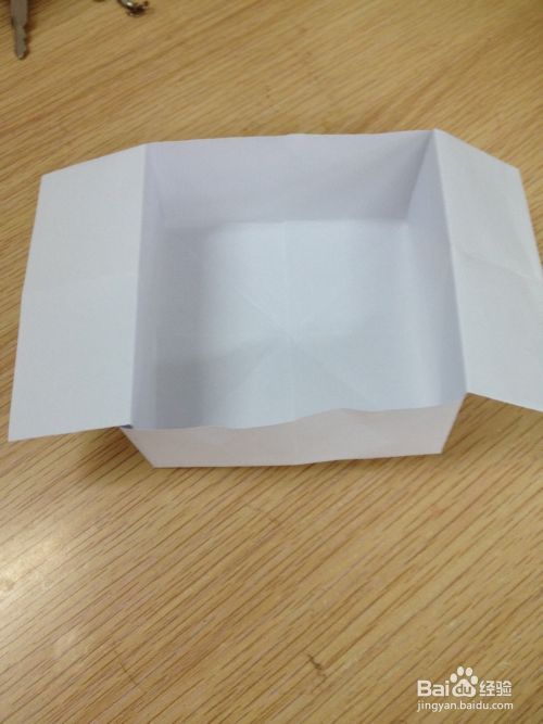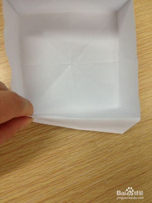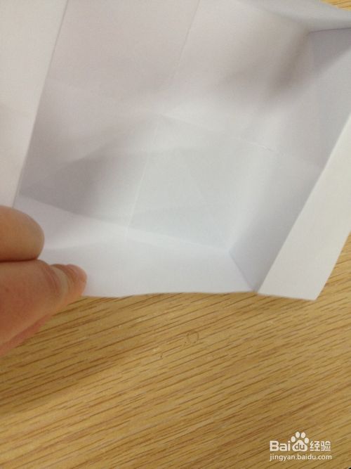 第八步,打开它,并沿着它的内部四边紧压桌面,将其折直,如图所示。这就形成了一个迷你的纸垃圾桶了!
