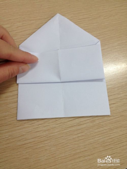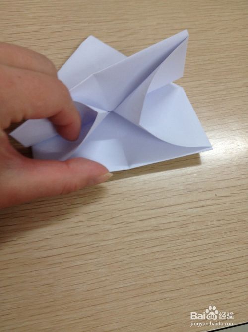 第四步,拿起一角,稍微展开它,对准上方的折痕,将其再凹折进去。如图所示。