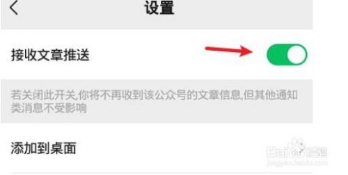 在设置页面,关闭“接收文章推送”的按钮,就可以取消订阅号的文字推送消息了。