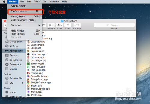 打开Finder之后保持Finder处于激活状态,这是的菜单栏显示的是Finder的菜单。