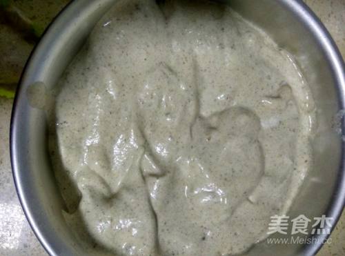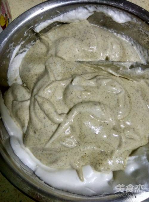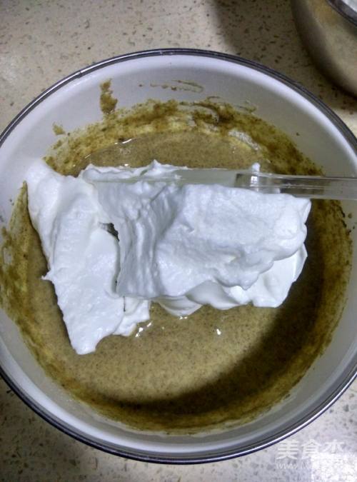 9取三之分一蛋白与面糊混合,用刮刀上下翻拌