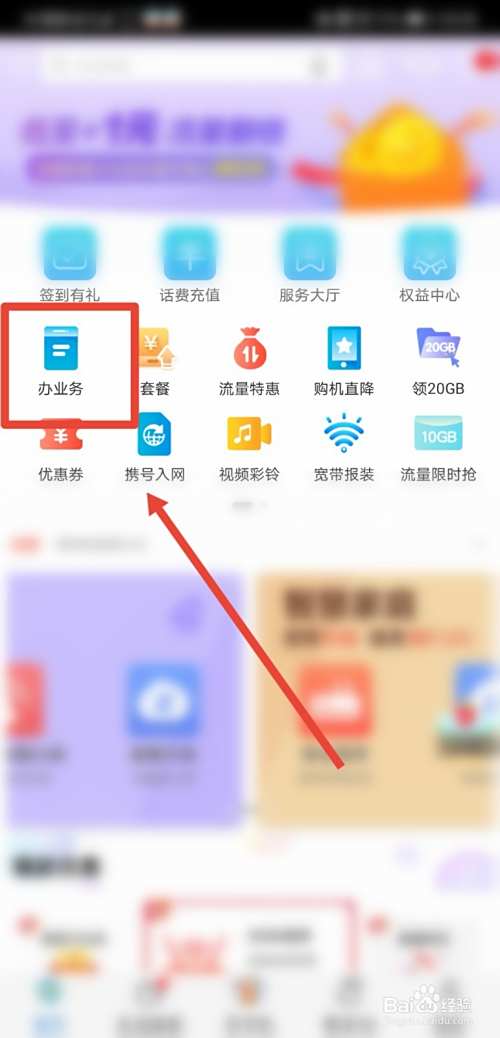 首先打开广东移动智慧生活app,在首页点击进入办业务功能;
