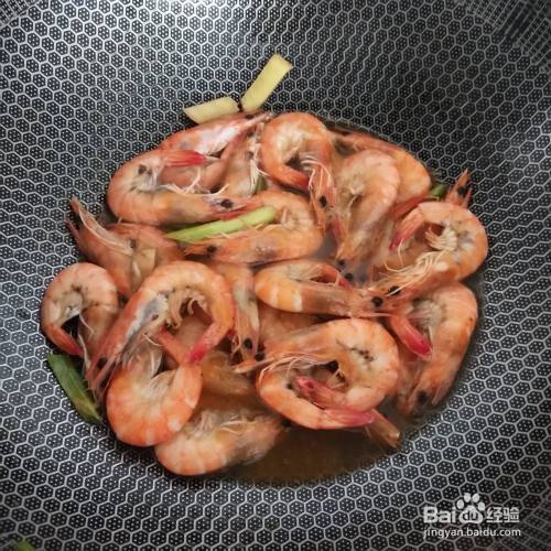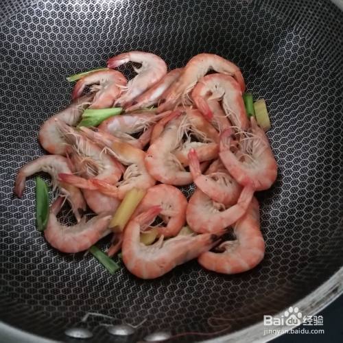 放入基围虾,炒到虾身发红,调入盐、白糖、醋和生抽炒匀。