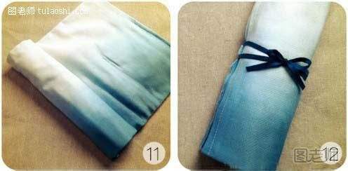将牛仔布网上折,正好包裹住那个短一些的笔刷,只露出笔毛