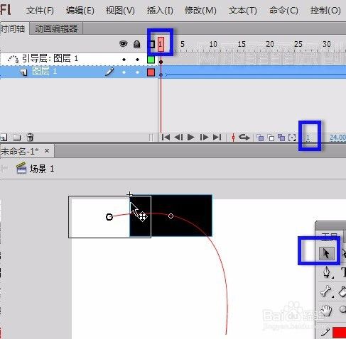 <1>播放头移动到第1帧,用选择工具选中舞台上的元件,移动位置,如下图1所示,移动到线条的最左端,你会发现,元件会自动吸附到线条的最左端