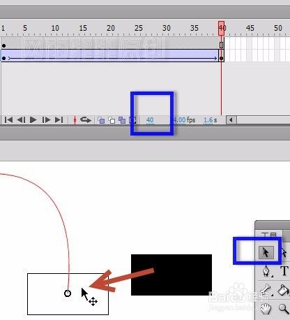 <2>播放头移动到第40帧,重复步骤<1>将元件吸附到线条的最右端,如下图2