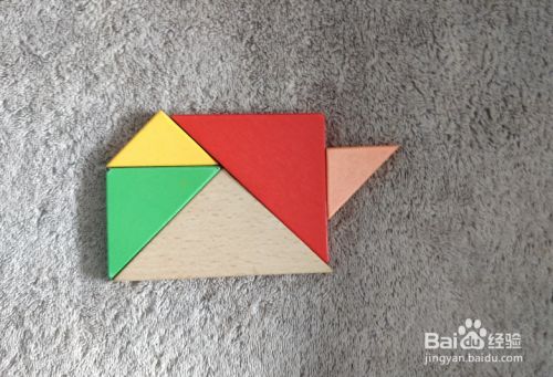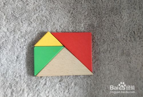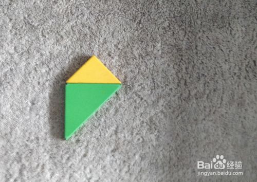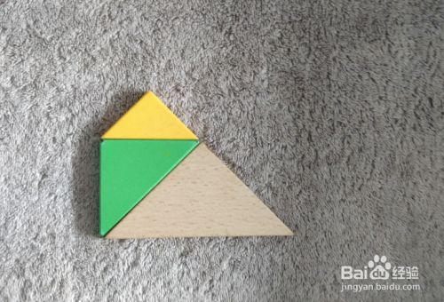 放上绿色三角形,上侧放上黄色三角形挨着,左端一齐,如图。
