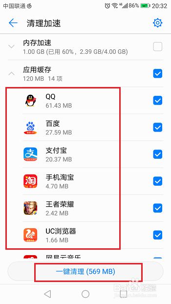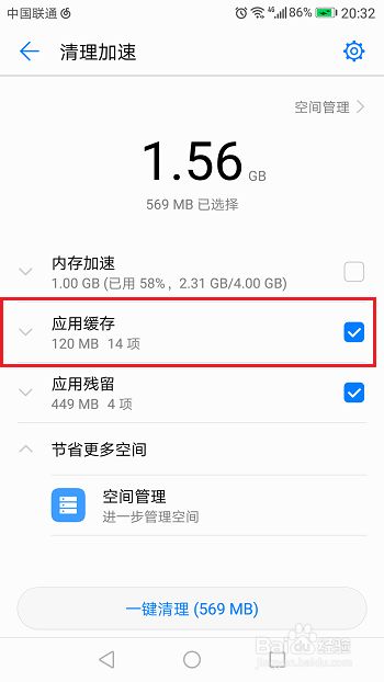 第五步点击应用缓存打开,可以看到各个应用的缓存占用的内存空间情况,点击一键清理,如下图所示: