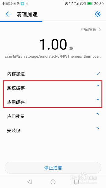 第三步进去清理加速的界面之后,需要等待一下,进行扫描手机系统缓存和应用缓存,如下图所示: