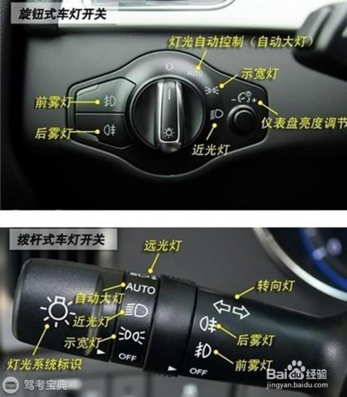 灯光控制开关大致分为两种,旋钮式车灯开关与拨杆式车灯开关。其中,前者多见于德系车辆,后者则被大多数非德系汽车厂家所使用。二者的操作方法不尽相同,但大致原理是一样的,把相关“旋钮”转动至灯光对应位置。以下操作流程以拨杆式车灯开灯为介绍对象。