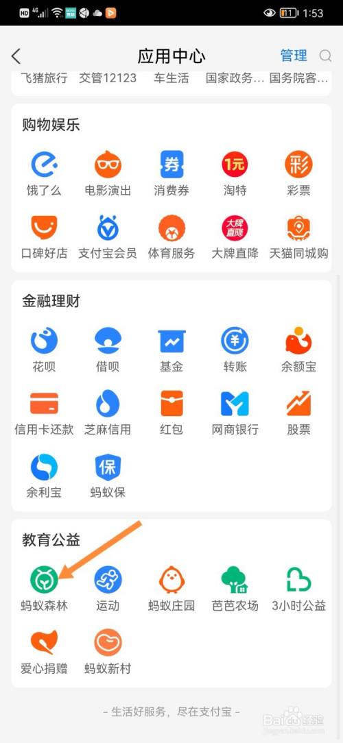 滑到底部,点击蚂蚁森林进入