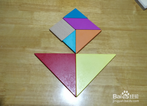 摆上中号三角形,放在下面小三角形的右侧挨着,直角在左侧上端,如图。