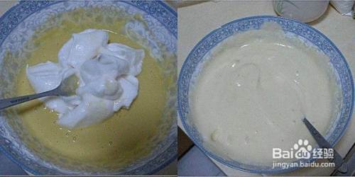 将蛋白分多次添加到蛋黄做成的蛋糕糊里,注意要上下翻动,像炒菜一样上下翻动的搅拌。切记:不能让蛋黄糊起筋,否则蛋糕就吃不成了!全部搅拌均匀即可。
