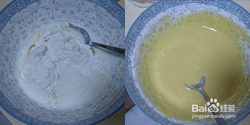 顺时针搅动蛋黄成淡黄色,约一分钟即可。然后加入三勺低筋(或中筋)面粉,六勺牛奶,两勺白糖,顺时针轻轻搅动(搅拌过猛会使面产生筋度,影响蛋糕质量)直到面团均匀混在一起。也可加入少量小苏打、调和油,这样蛋糕会更松软。搅拌过程中,会出现许多面疙瘩,需要耐心压扁。