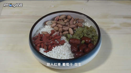 放入红枣、葡萄干、花生、红豆。