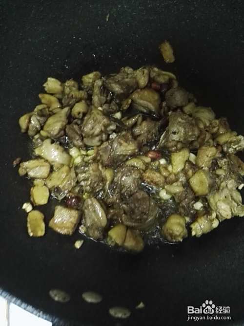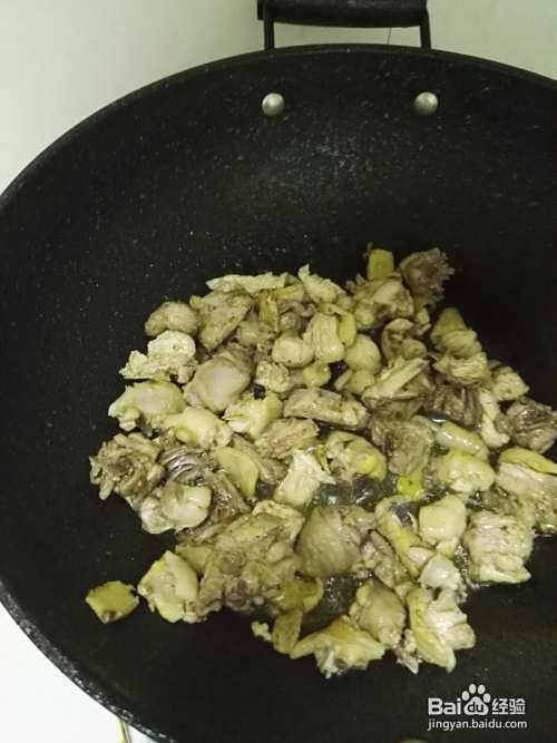 锅中放入油,油热后放进姜片和鸡肉一起爆炒,中间加点酱油,这里要炒久一点,炒到鸡肉带金黄色就可以了,接下来炒糍粑辣,可以先把鸡肉弄到一边,也可以盛出来单独炒,炒糍粑辣要中小火,翻炒几下就可以与鸡肉混合在一起炒了。