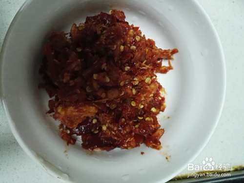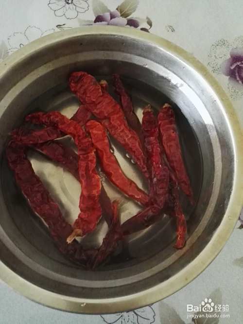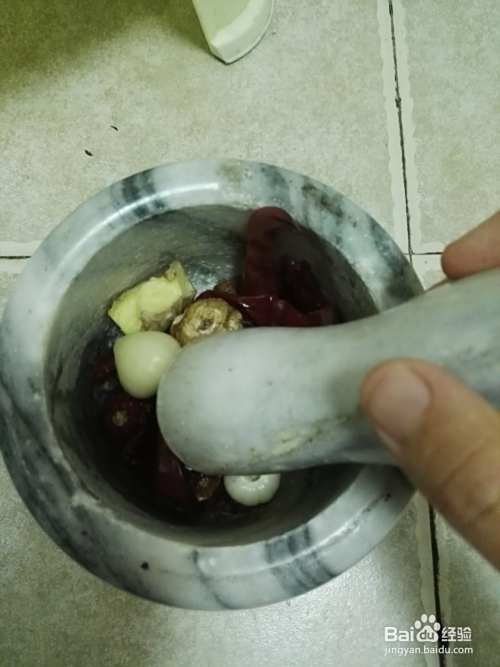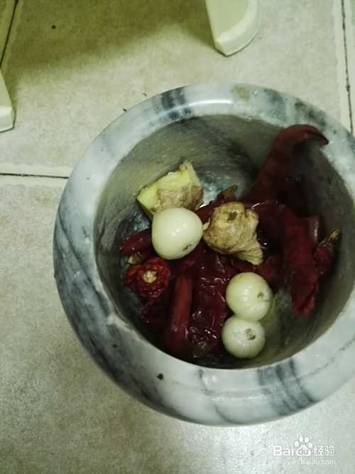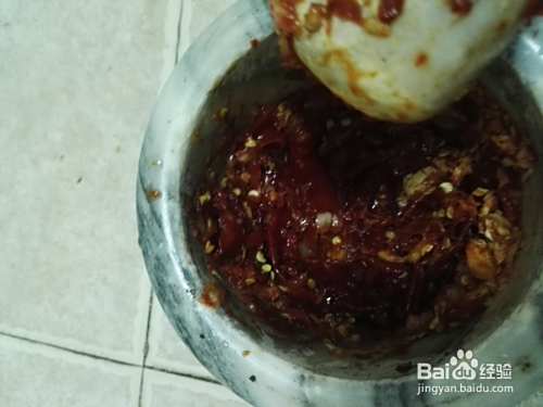 现在准备做糍粑辣,把干辣椒用热水泡个10分钟,然后找个研钵把泡软的辣椒放进去,准备一点蒜和姜放进去,一起捣烂,捣掉辣椒说姜蒜融合一起就可以了。具体如图所示。
