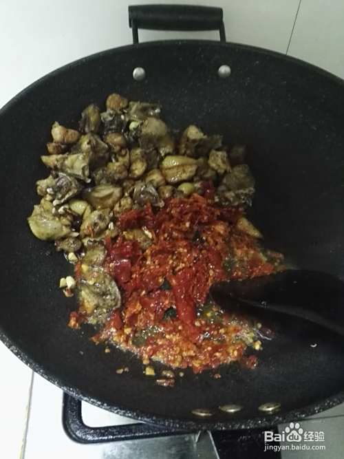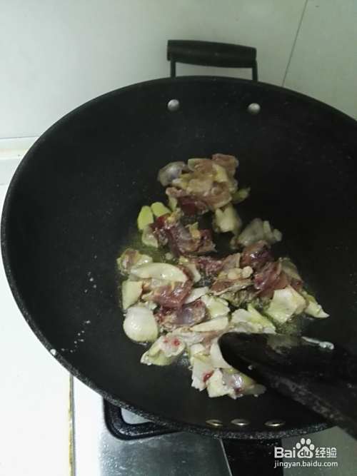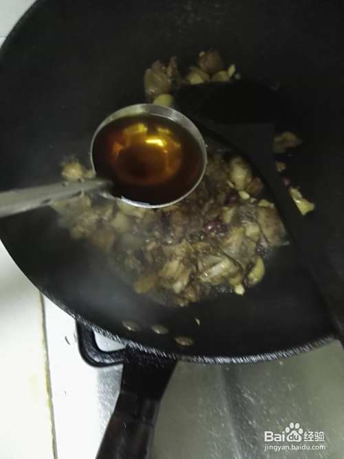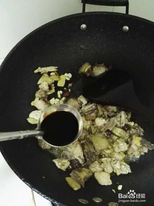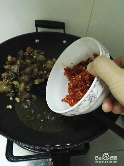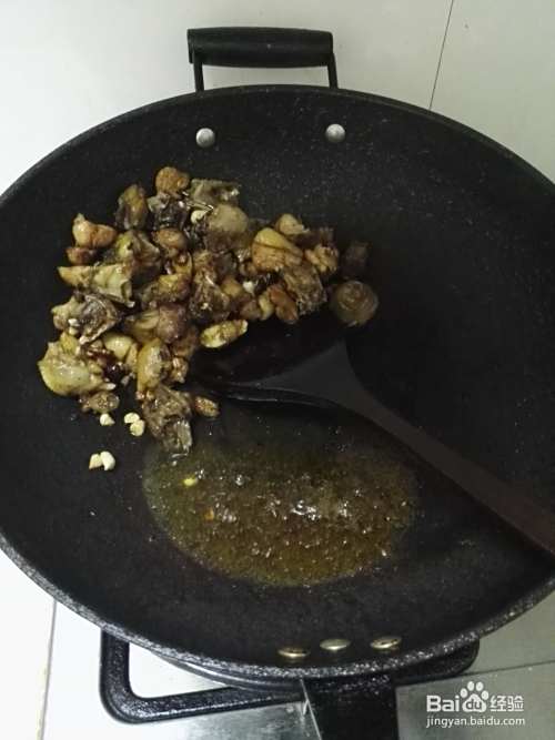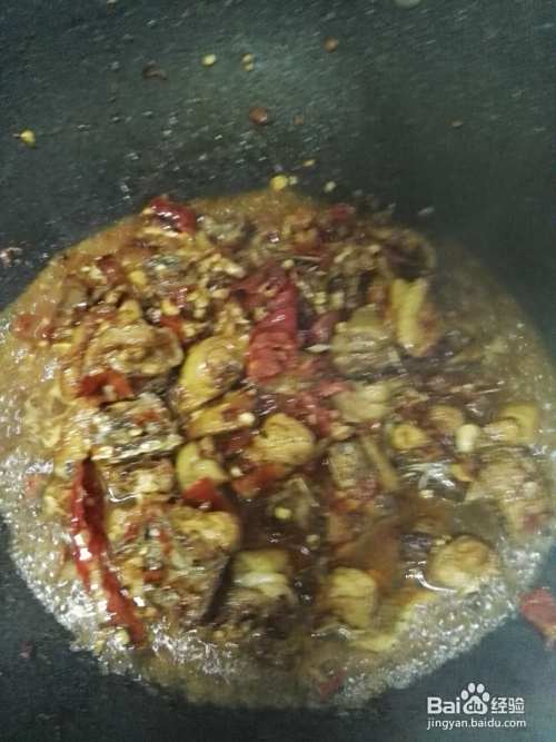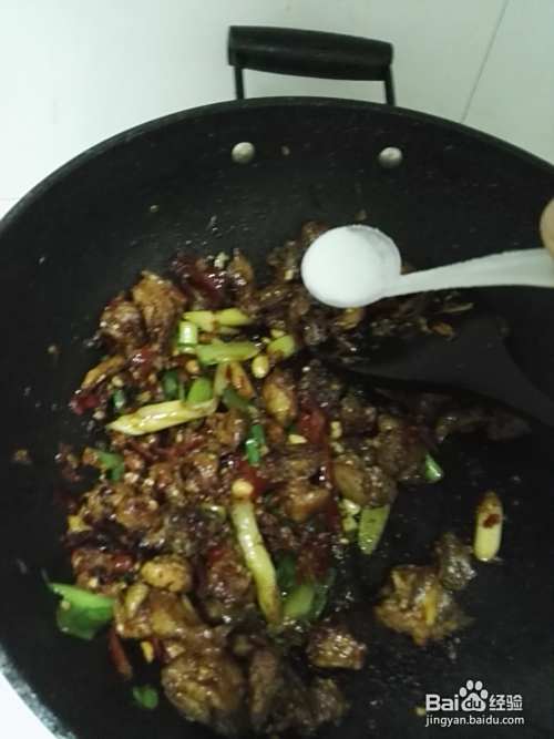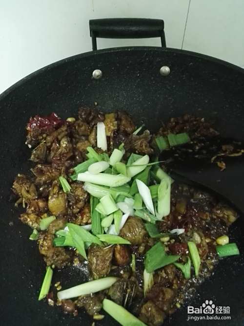 放入料酒,放少许水中小火焖5分钟,最后在出锅前放入大蒜苗和盐调味,一道辣子鸡就完成了。