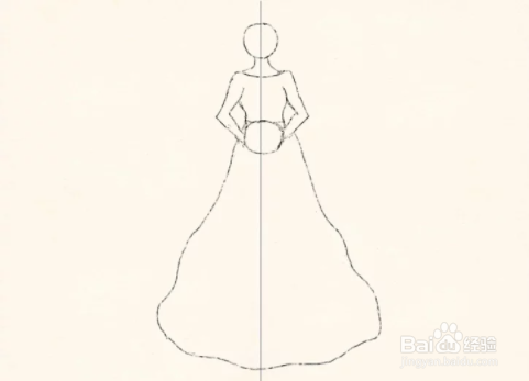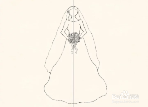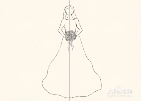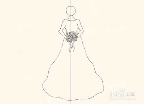画出整个裙子。将裙子的轮廓一直延伸到底线。擦除中心的垂直线留下花束所在的圆圈。