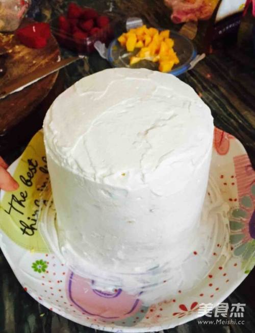 5准备一个托盘 放入刚刚切好的裸蛋糕 一层一层的抹奶油 叠加 上面可铺入火龙果 芒果 等水果