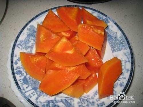 锅内放入木瓜块、冰糖和少许水,炖20分钟左右,然后倒入纯牛奶再煮3分钟。