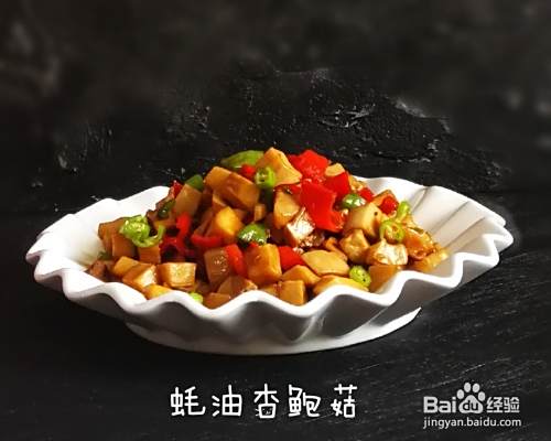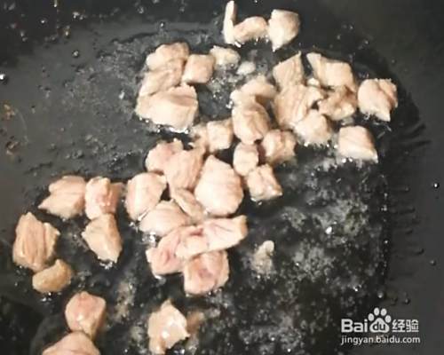 锅中放入适量的油,放入肉丁炒香,放入杏鲍菇,中火,翻炒两分钟。