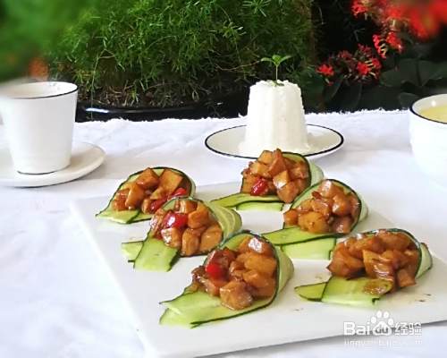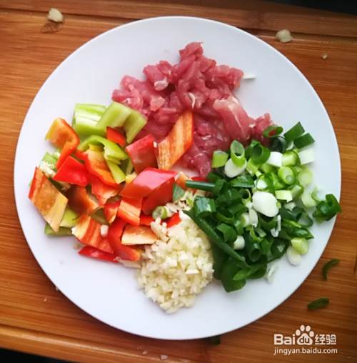 准备配料,肉切丁儿,葱姜蒜都切丁儿,青红辣椒切成小块儿。
