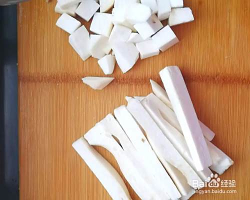 将杏鲍菇,切成厚一点的片儿,用筷子垫上,横切。然后再竖着切,不要切断,做法和上面的一样。