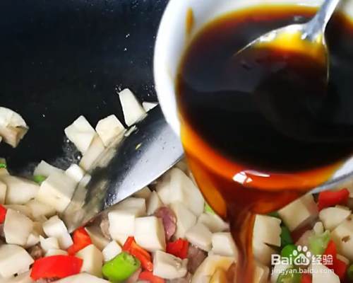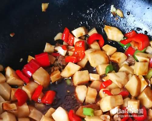 放入郫县豆瓣酱。翻炒几下。再放入葱姜蒜,青红辣椒,放入调料汁,少许的十三香。