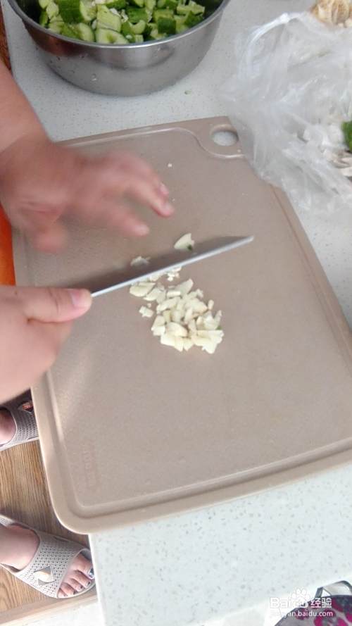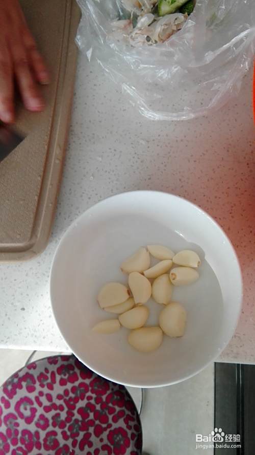 用菜刀刀背拍大蒜 然后切几刀之后放入