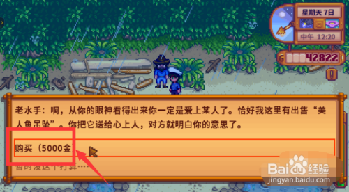 当达到十颗心的好感度时,到河边,等待断桥时,出现的老水手npc,在老水手这里购买“人鱼吊坠”作为定情信物。